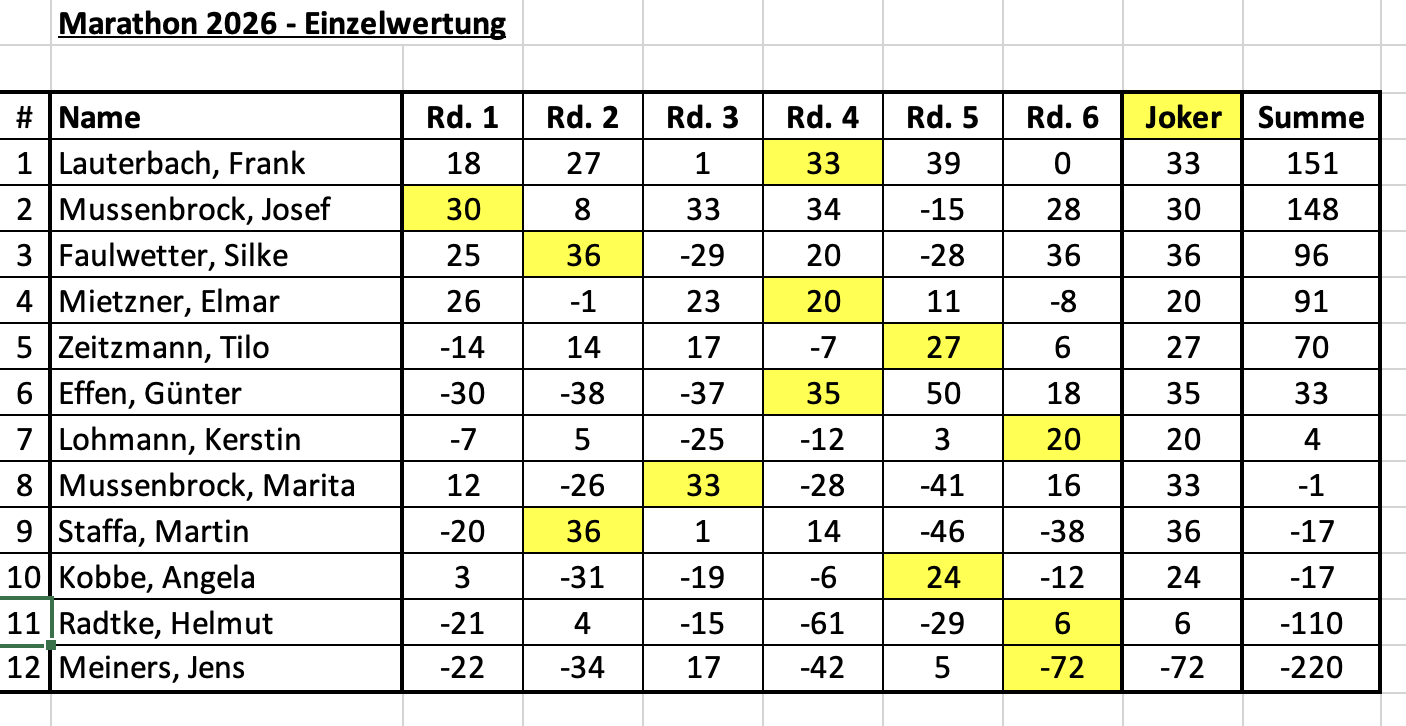 Das letzte Marathonturnier fand am 01.03.2025 statt. Wir waren 20 Teilnehmende.